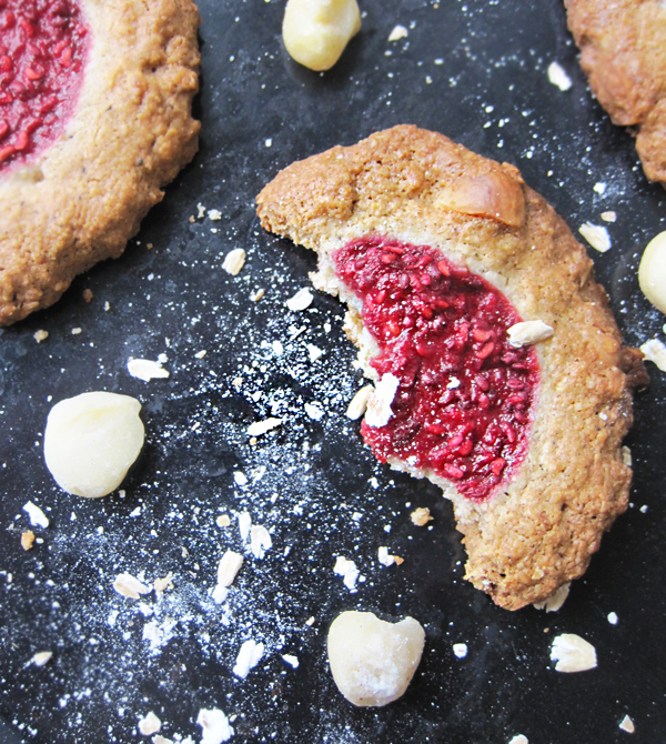 Vadelmaisten makadamia-kaurakeksien resepti on hieman mukailtuna My New Roots -blogin uudesta ihanasta keittokirjasta. My New Roots taitaakin olla niitä ihan ensimmäisiä ruokablogeja mitä aloin aikoinaan seuraamaan. Jos olet blogin fani niin suosittelen kirjaa lämpimästi (ja tietysti muutenkin)! Reseptit (niitä on paljon!) on koostettu sesongittain, ja reseptien lisäksi kirjassa on paljon muutakin sisältöä mm. erilaisista ruoanlaittotekniikoista ja raaka-aineista. Ja kuvat ovat todella kauniita, mitäs sitä nyt voi muuta odottaakaan. Omani tilasin Adlibriksen kautta, ei maksanut kuin vähän päälle pari kymppiä eli hinta-laatusuhde on kyllä enemmän kuin kohdallaan.